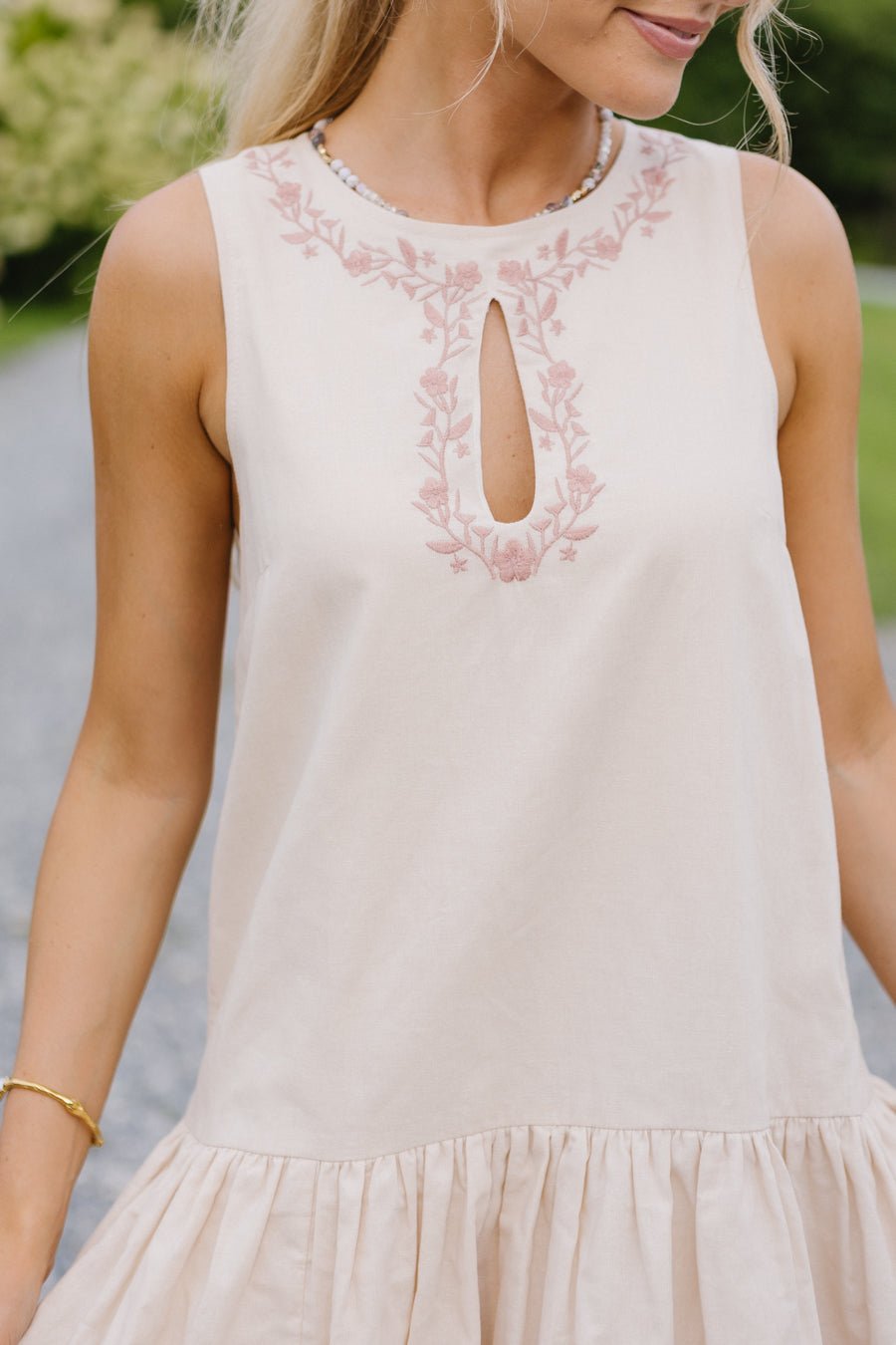 - Rose colored embroidery at neckline